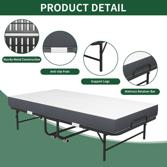 Modern Metal Folding Bed Frame With Foam Mattress, Easy Storage & Mobility - Black