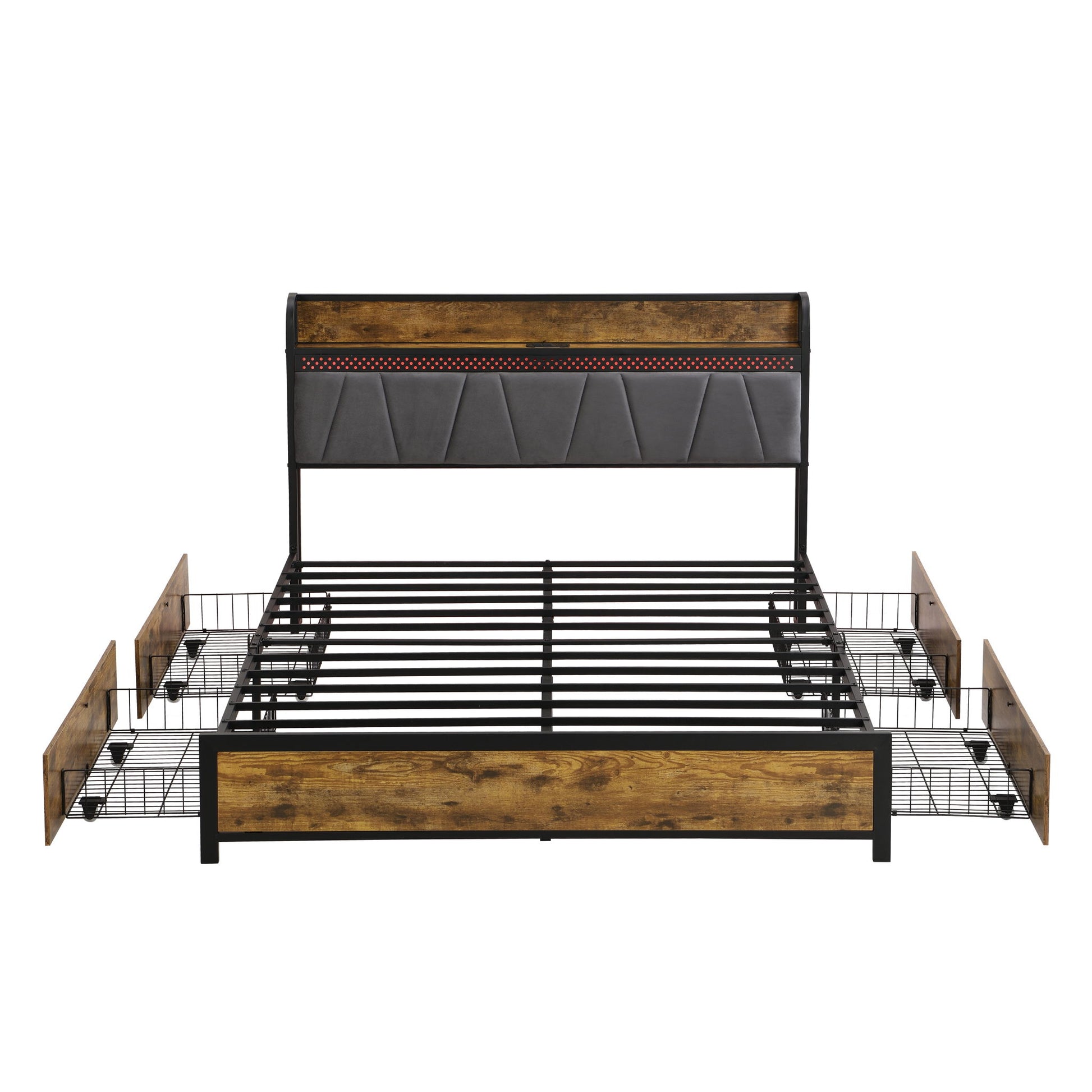 Modern Queen Size Bed Frame With Storage Headboard Charging Station LED Lights And Metal - Black / Brown / Gray