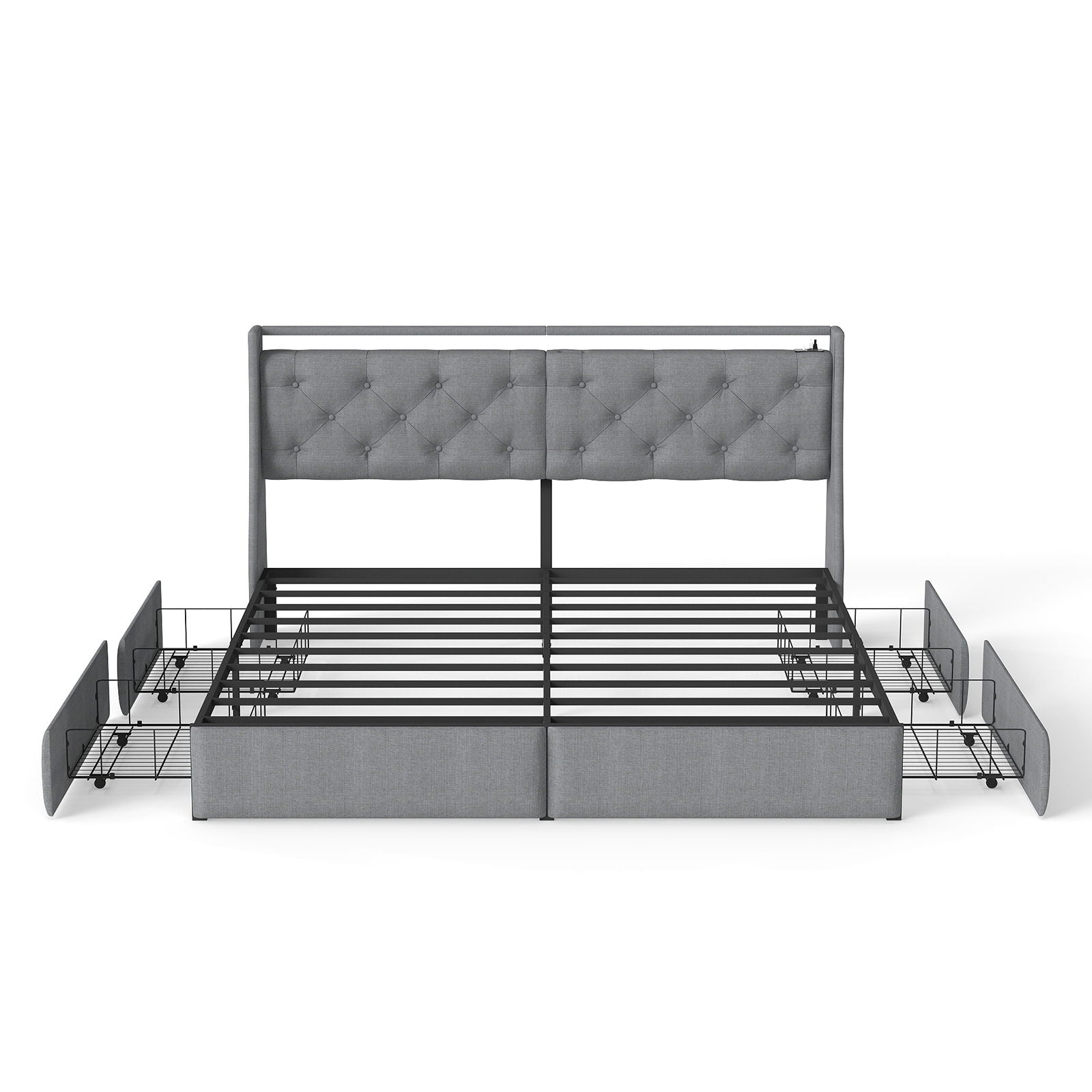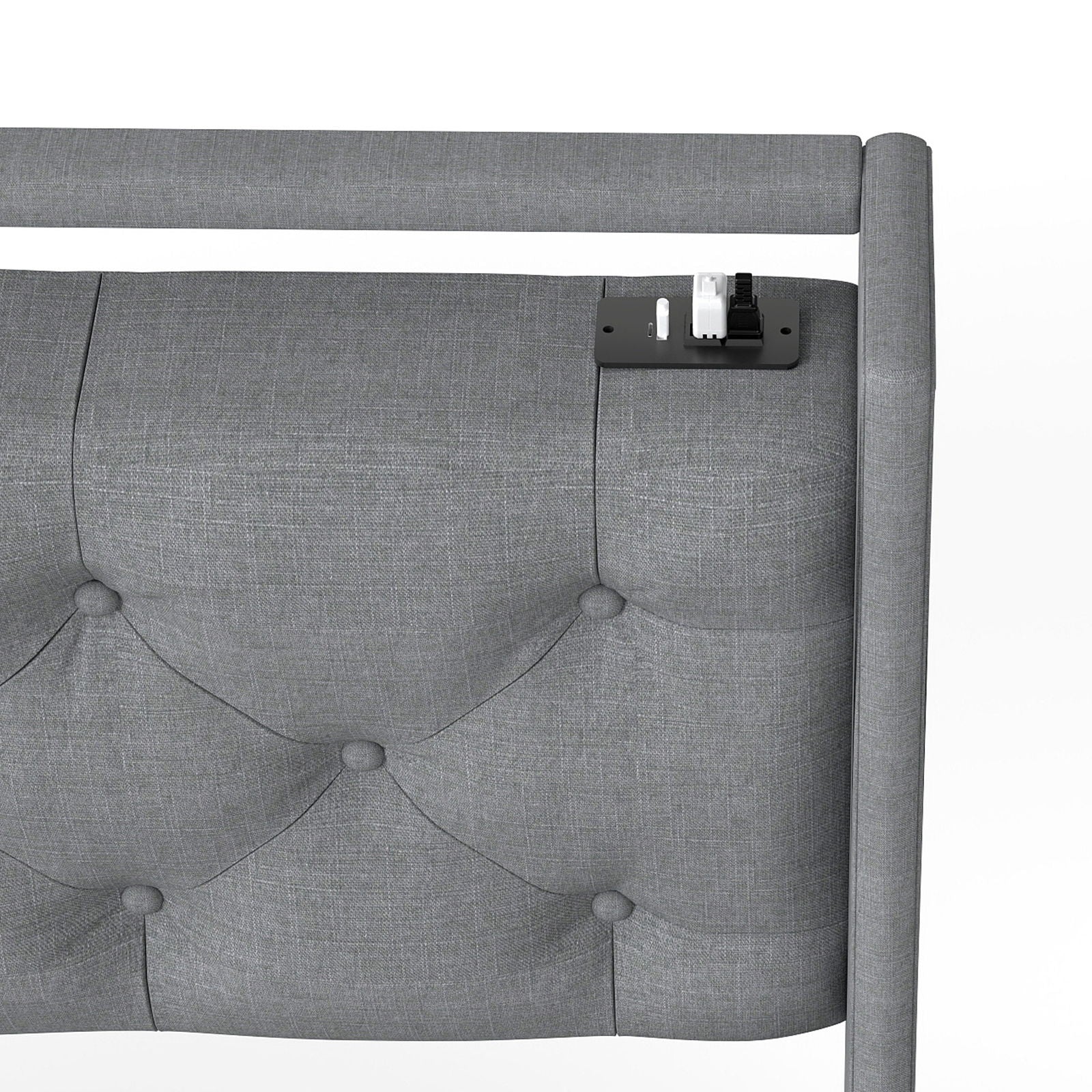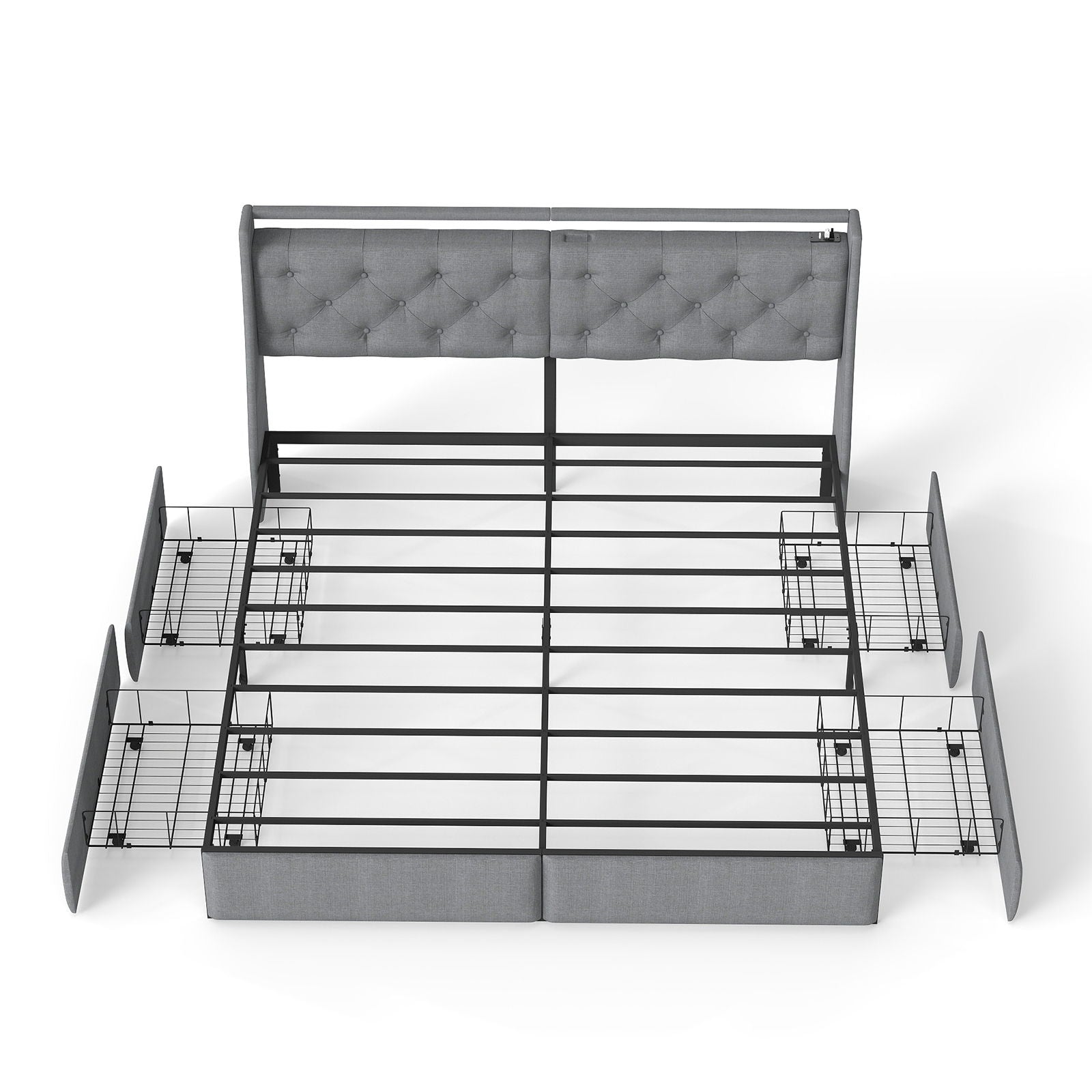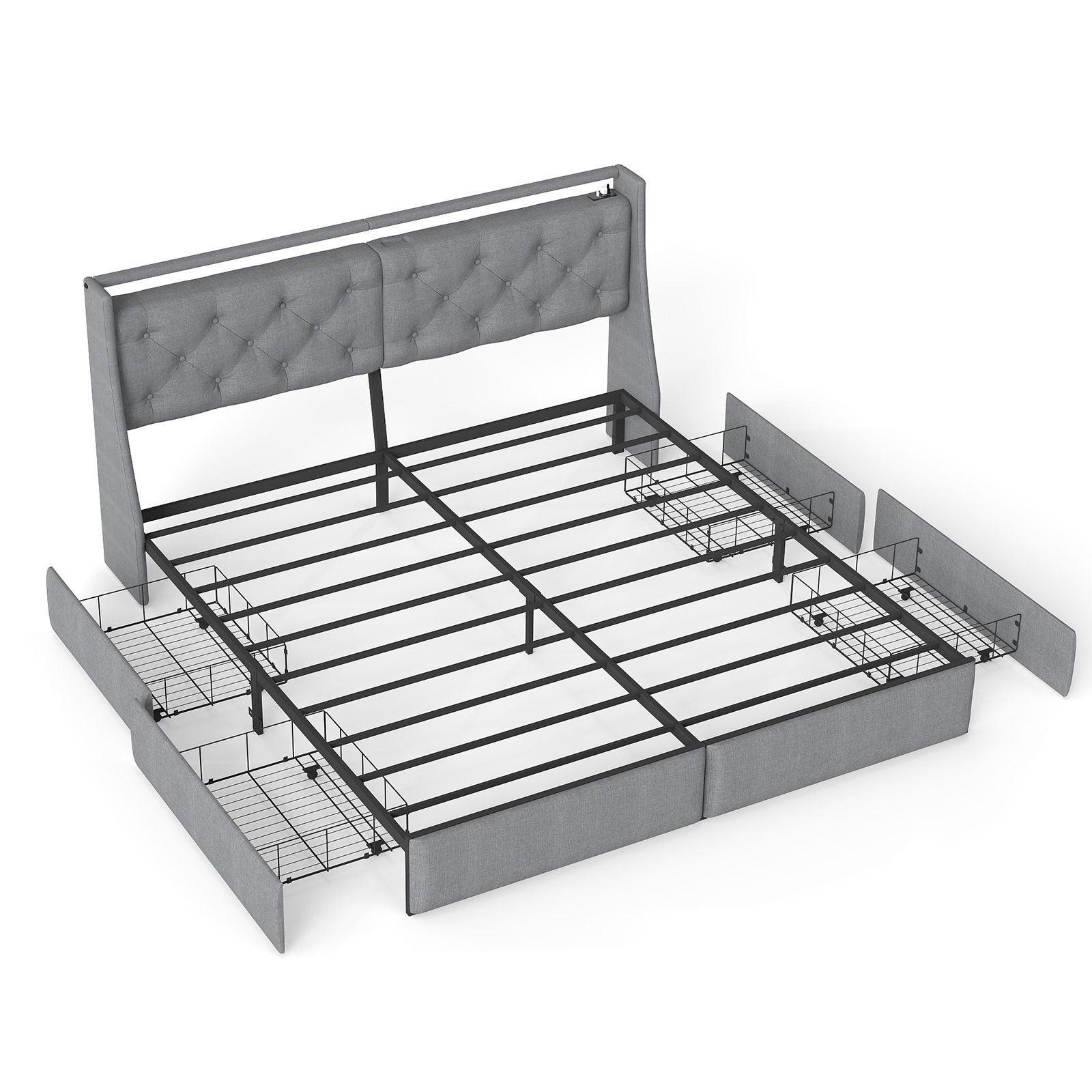 King Platform Bed Frame With RGB LED & Charging Station Storage Headboard, 12 Color Ambient Lighting - Gray