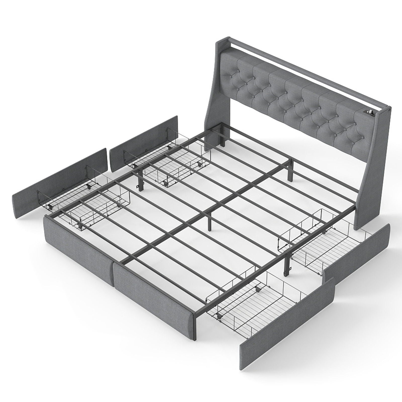 Queen Platform Bed Frame With RGB LED & Charging Station, Storage Headboard - Gray